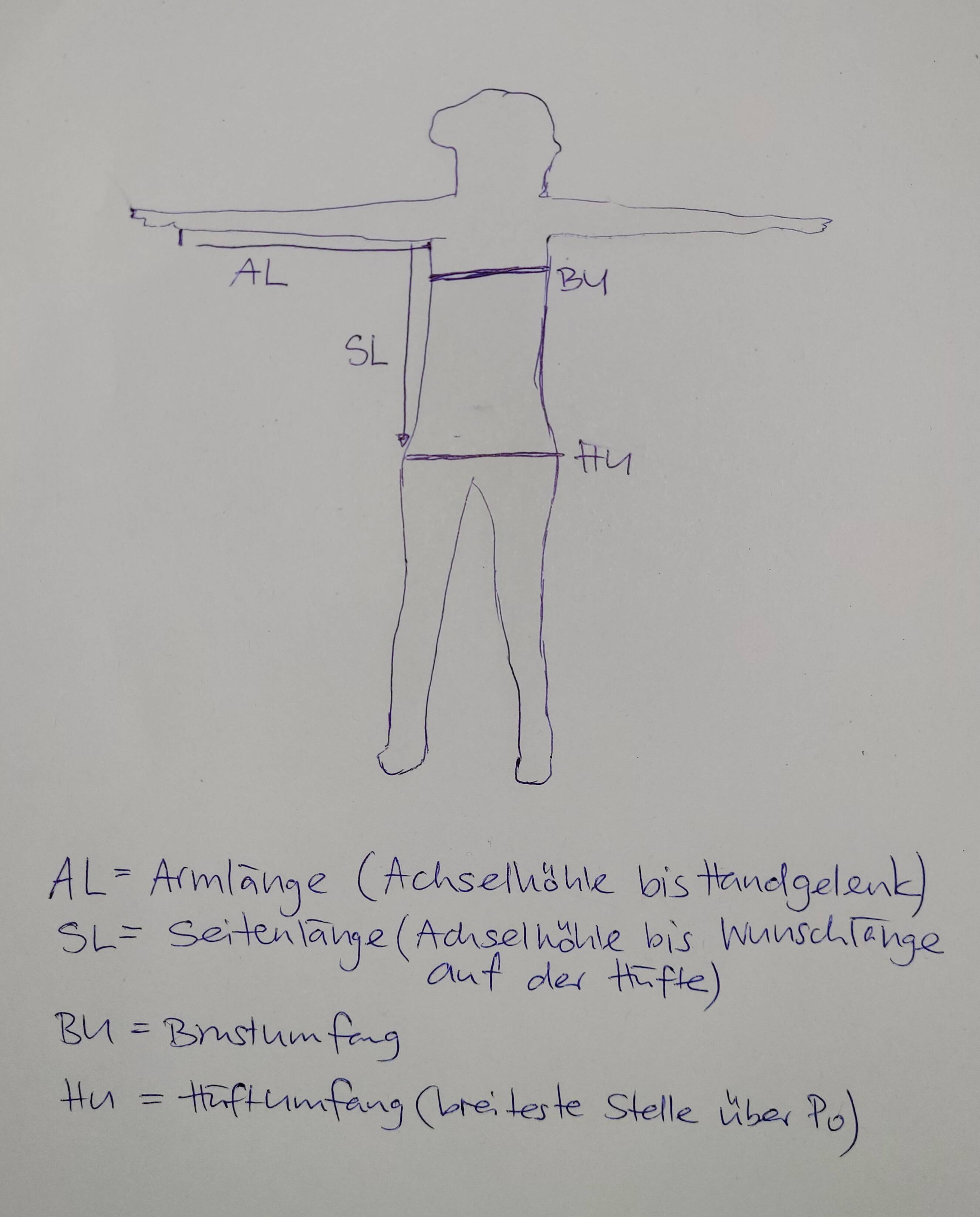 Messe über der Brust und über der Hüfte die jeweils breiteste Stelle mit einem Massband aus. Diese Masse musst du mir per E-Mail zusenden, damit ich das Kleidungsstück entsprechend anpassen kann. Falls du z. B sehr gross oder klein bist, oder du sehr lange oder kurze Arme hast, teile mir dies bitte mit!